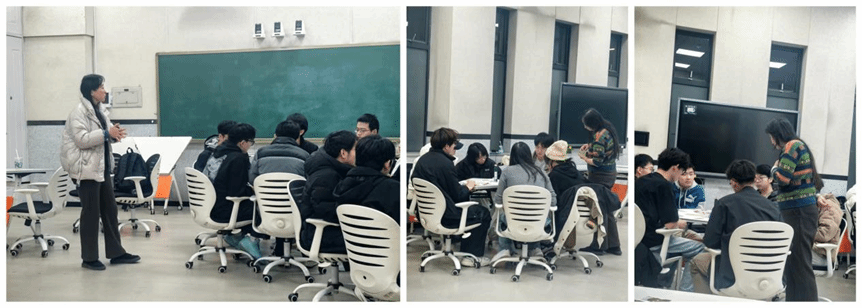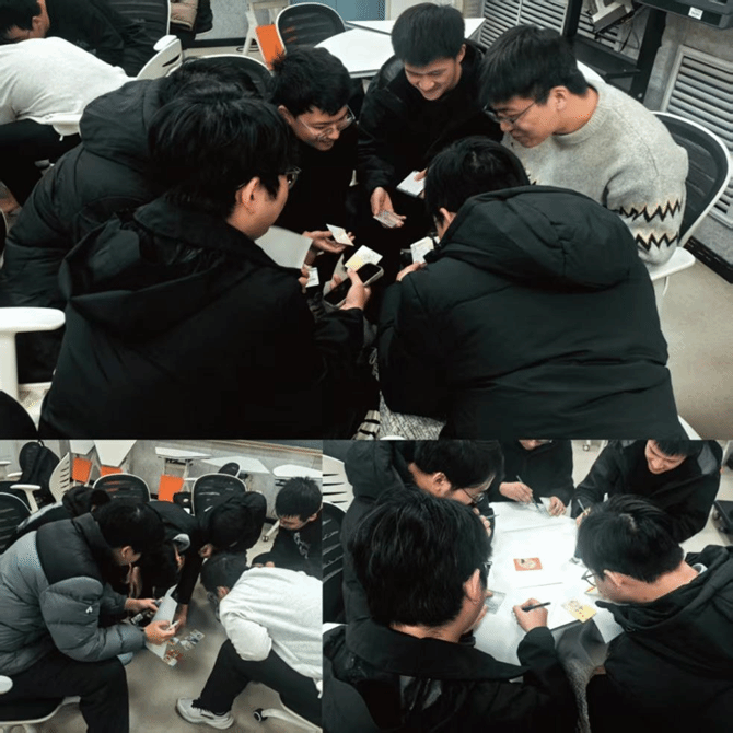 随后的“卡片寻友”环节趣味盎然。同学们随机抽取卡片,仅凭肢体语言诠释卡片内容,在人群中寻找“知音同伴”。当大家成功组队后,各小组充分发挥创造力,将手中的卡片串联成一个个情节完整、寓意深远的小故事。有的小组以“探索”为线索,讲述了突破科研困境的历程;有的小组围绕“陪伴”展开,传递了学术道路上人际支持的温暖。生动的故事分享,让同学们在协作中增进了彼此的理解与信任,也为科研中的团队协作积累了情感基础。