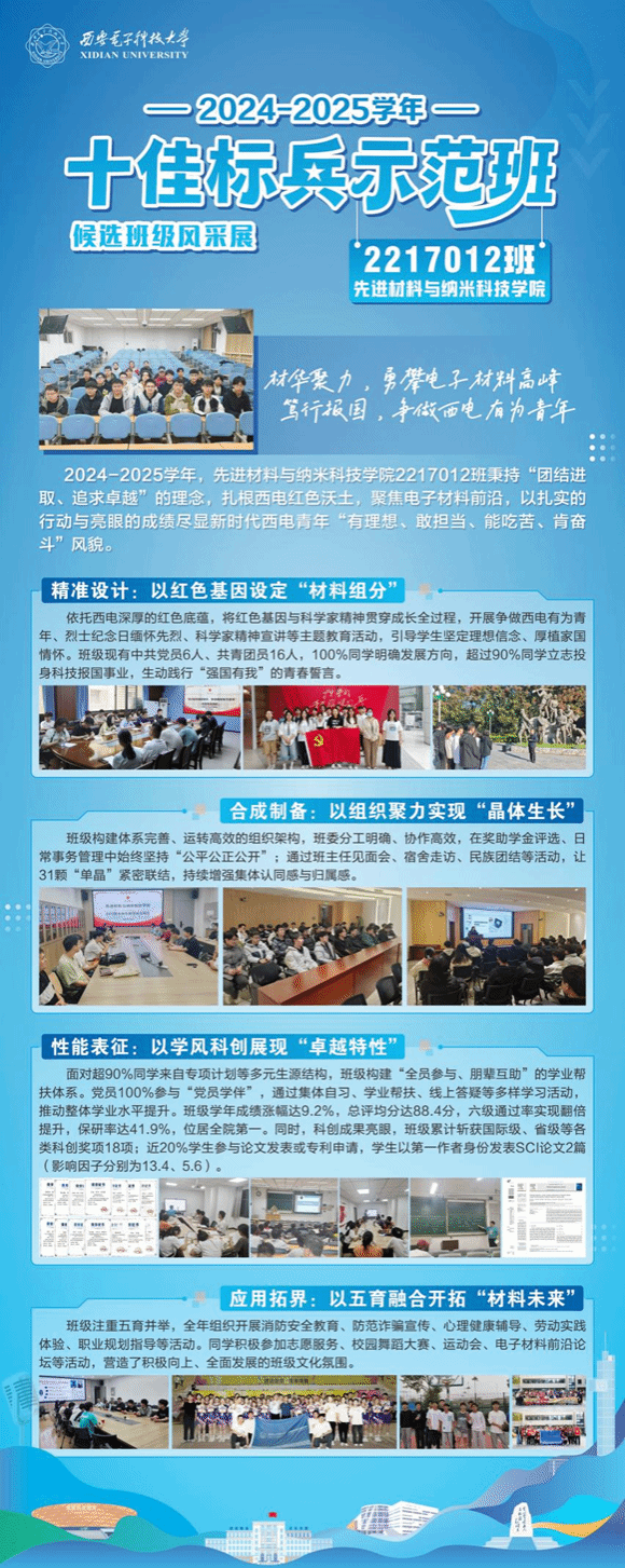 班级注重五育并举,全年组织开展消防安全教育、防范诈骗宣传、心理健康辅导、劳动实践体验、职业规划指导等活动。同学积极参加志愿服务、校园舞蹈大赛、运动会、电子材料前沿论坛等活动,营造了积极向上、全面发展的班级文化氛围。